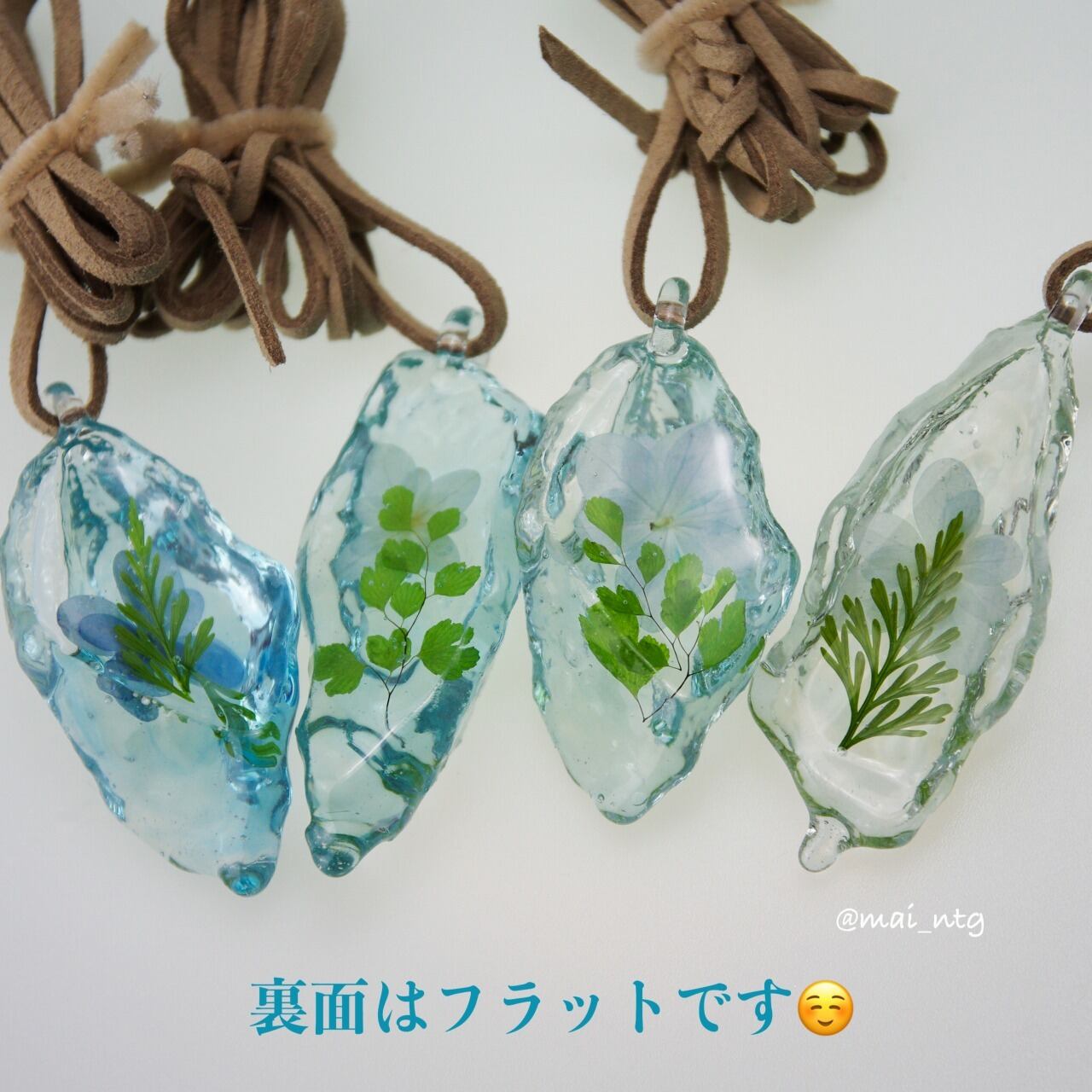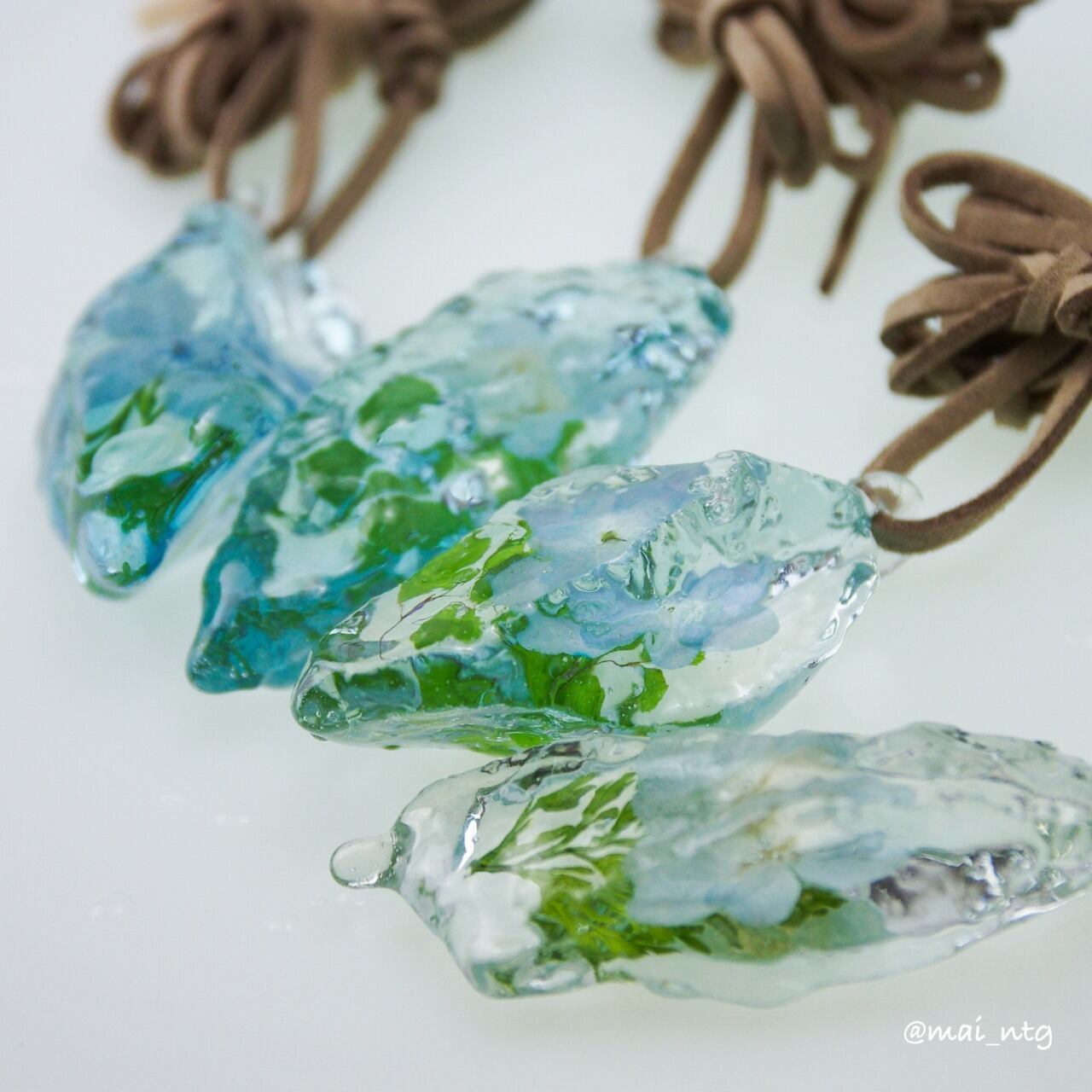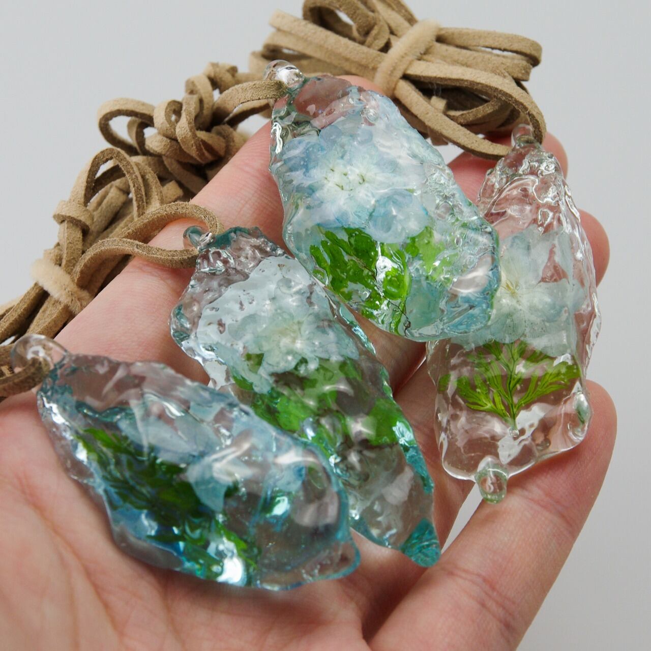 氷のような樹脂の中にお花を閉じ込めた作品です。