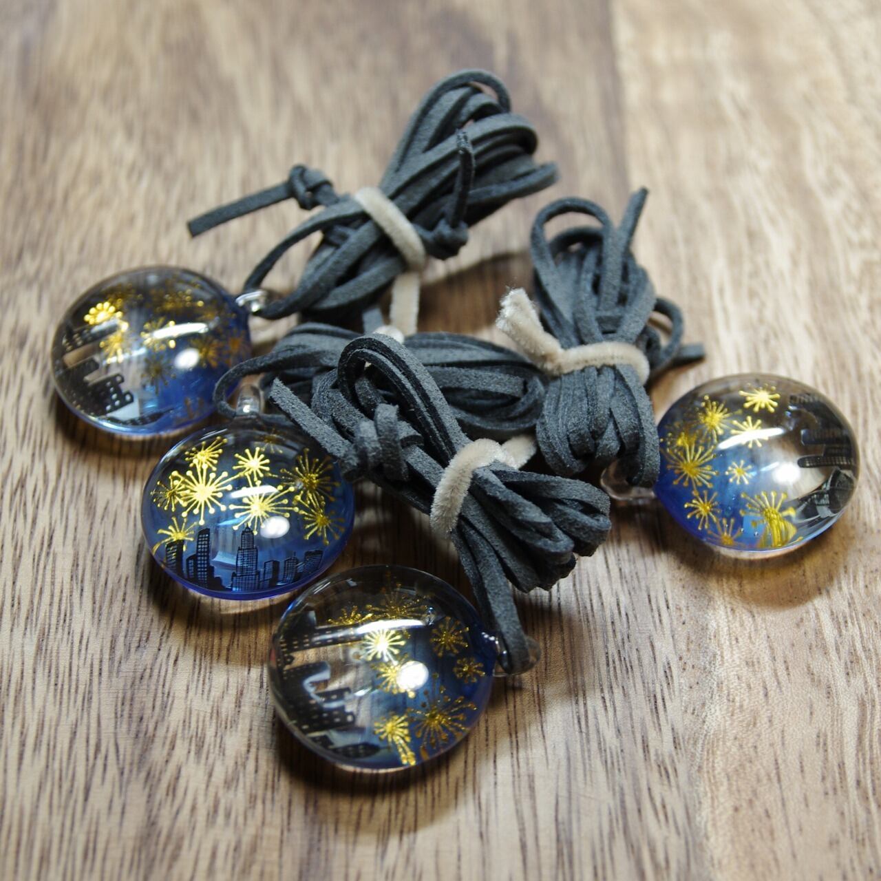 街のシルエットの後ろで花火がはじける元気な作品です♪