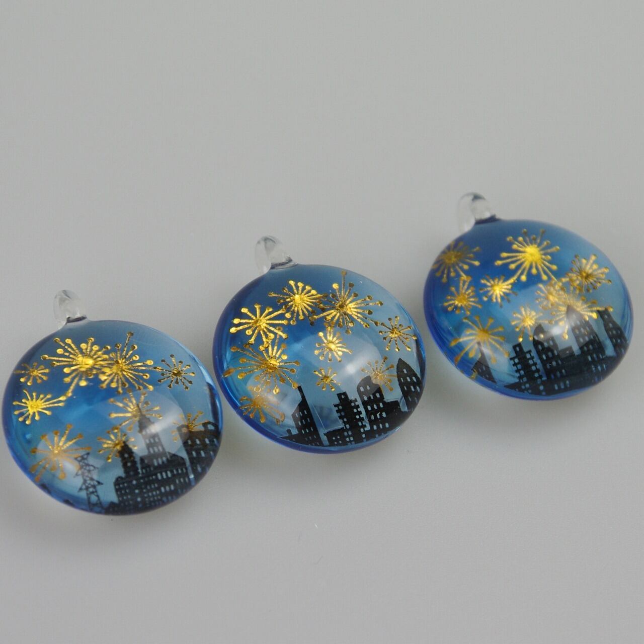 街のシルエットの後ろで花火がはじける元気な作品です♪